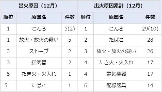 こんろ欄の( )内は天ぷら油火災・・・12月に(2)件|年間で(10)件発生